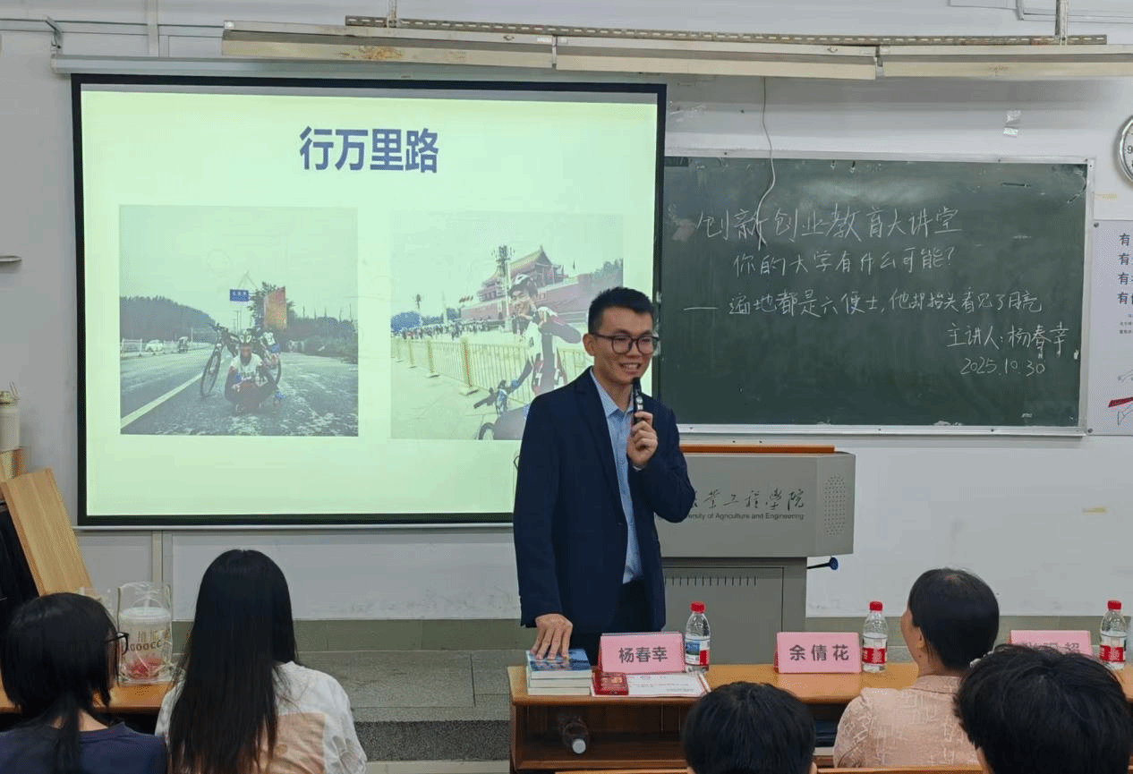 讲座中,杨春幸围绕“理想三寻:寻找自我、寻找工作、寻找理想”展开分享,结合自身大学时期广州骑行至北京的自我挑战、毕业后职场经验积累及长期坚持阅读、出版《万里入心》专著的理想实践,系统梳理从迷茫探索到理想落地的过程和方法,并分享“人生就是一场创业,把自己作为方法”的人生感悟,为学子们勾勒出“从探索到创造”的理想实践路径。